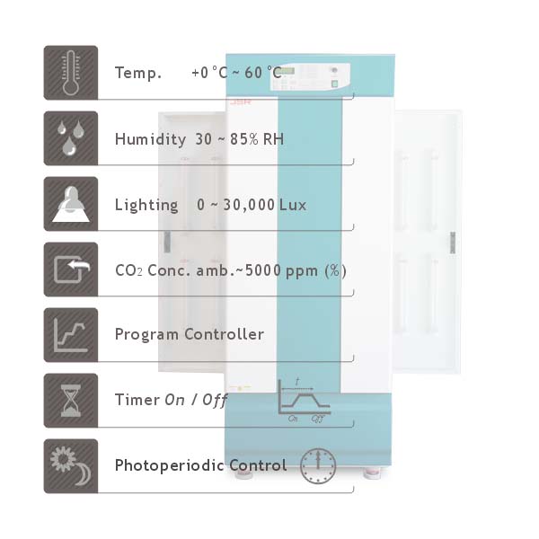 Forced air circulation of controlled temperature and humidity to achieve excellent thermal uniformity Durable Stainless Steel 304 Sheath Heater and copper-aluminum finned evaporator Temperature control within 0.1°C resolution Humidity control within 1 % RH resolution Lighting control from 0 ~ 30,000 Lux by 8 Step light intensity for photoperiodic Day-Night simulation Lamp-on-Delay System by turn on lamp one by one which provides gradual increase of light to eliminate sudden light intensity change CO2 concentration control within 1 ppm (1%) resolution Separate heating and cooling compartment prevents contamination and maintenance free Cooling system with hermetically sealed compressor